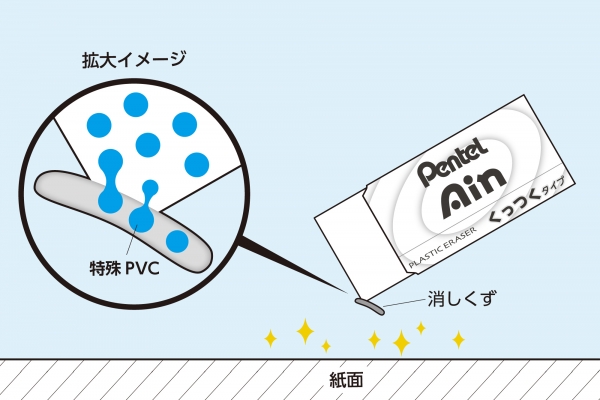 消しゴムの材料に、新規特殊PVCを配合しています。消しゴムを使用して、くずが生じるとき、含まれる新規特殊PVCの一部が消しゴム本体とつながる役割を果たすため、消しくずが紙に残らず、消しゴムにくっつきます。先端にくっついた消しくずは、つまんで簡単に捨てることができます。