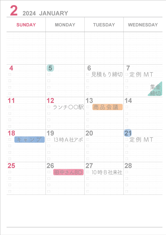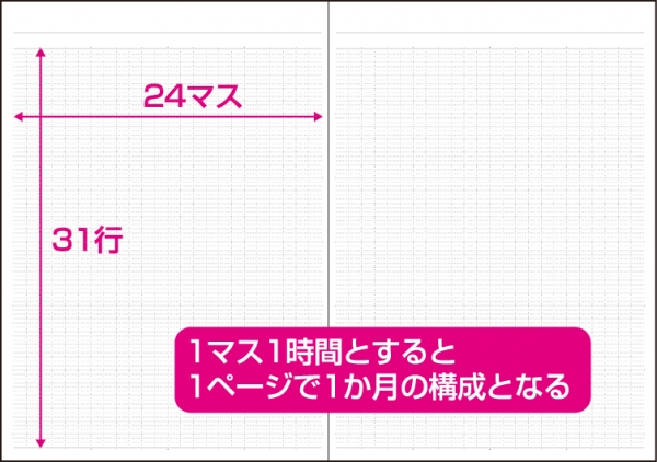 定番の「月間ノートタイプ」には1ページあたり31行24マス構成のノートページを収録しているので、1日1行を使って1か月の予定を組むことや、一行日記など、自由な使い方ができます。またマンスリーページはカレンダーと同じ日曜日始まりで、デスク用や2冊目の手帳として最適です。