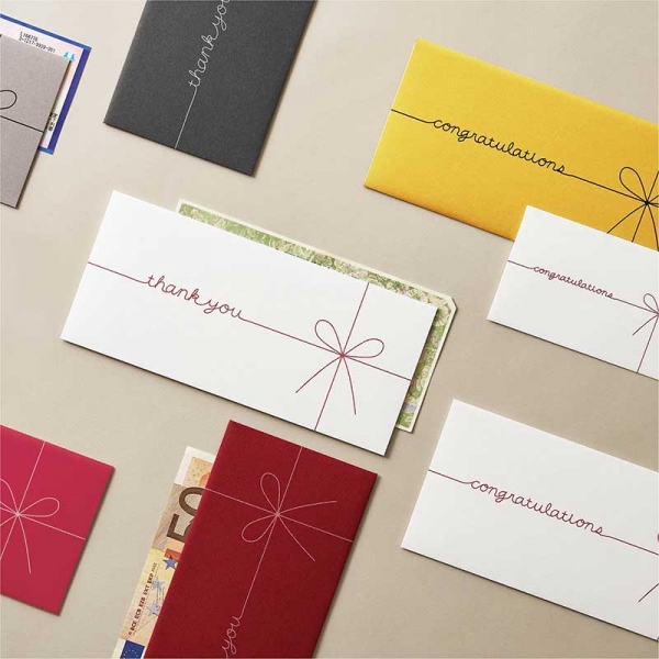 『ギフト券袋』は、感謝やお祝いのメッセージを1本のリボンで綴ったデザインの封筒で、ギフト券や商品券、お札などを入れることができます。かしこまりすぎずカジュアルな場面にも使えるデザインである点が特徴です。