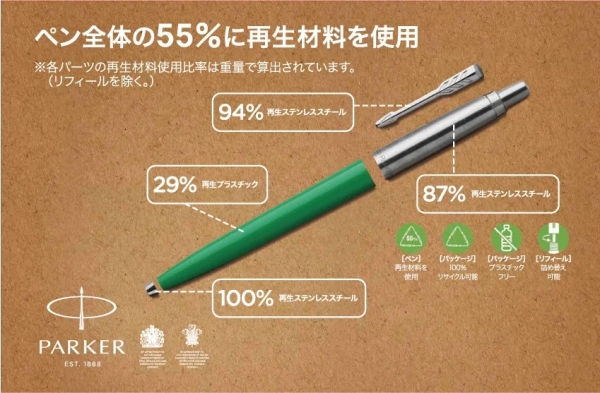 そして2023年、パーカーが願うこと、それは環境に優しい地球。この願いを表現すべく「ジョッター オリジナル ジェルペン」が再生資材55%*を使用したペンに生まれ変わります。