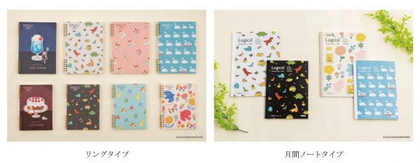 表紙デザインはリングタイプと同じように、恐竜のゆるいタッチが可愛いザウルスランド柄、花と鳥がおしゃれなフラワーと白鳥が可愛いスワンの動物柄の2シリーズの4品番の展開です。