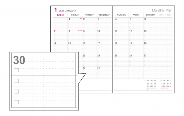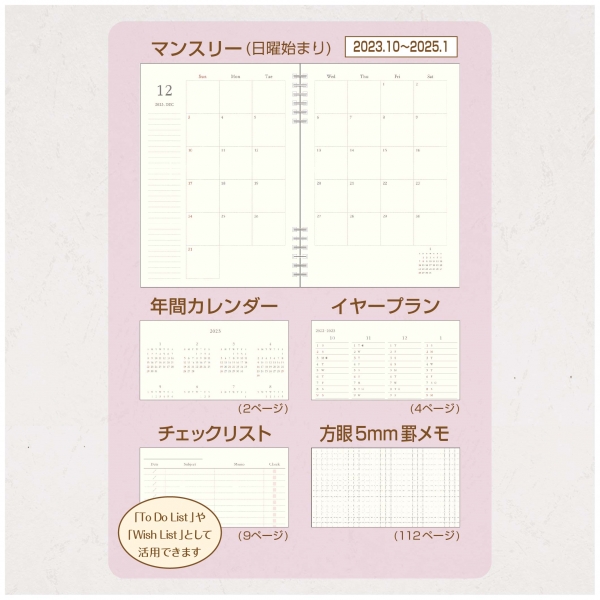 本文用紙はクリームベースで優しい色合いの用紙を使い、カレンダーと照らし合わせやすい日曜始まりの月間ブロックタイプです。年間予定が俯瞰して把握できる年間カレンダー・イヤープランのほか、To Do ListやWish Listとしても活用できるチェックリストページを収録しています。メモページは使いやすい方眼5mm罫を採用しています。