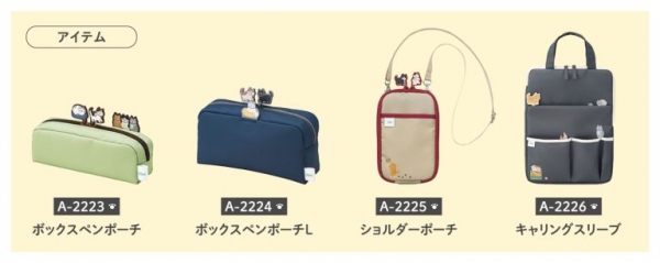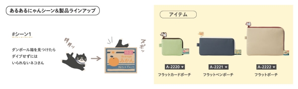「ダンボール箱を見つけたらダイブせずにはいられないネコさん」を表現した薄型のポーチです。L字のファスナーをすべて開くと、ネコ型のファスナートップがダンボール箱タグに入るデザインです。カードケースやコインケースとして使えるフラットカードポーチ、ペンポーチや通帳ケースとして使えるフラットペンポーチ、バッグの中身の整理に使えるA5サイズのフラットポーチの3サイズをご用意しました。