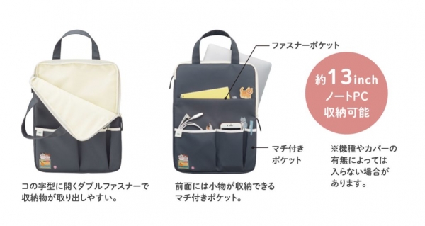 タブレットやノートパソコンと、小物を一緒に持ち運びできる薄型ポーチです。コの字型に開くダブルファスナーのメインポケットには約13インチのノートパソコンが収納可能です。前面には小物が収納できるポケットとファスナーポケットが付いています。バッグから取り出しやすいハンドル付きのため、そのまま手提げバッグとしても使用できます。