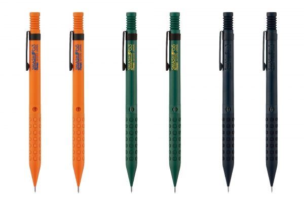 1986年に先行して発売していた製図用シャープペン「グラフ1000」をベースに、タフに使える一般向けシャープペンとして1987年に発売しました。特徴的なフォルムを生み出しているペン先と一体型のグリップは、筆記時のペン先の緩みを無くし、ブレない書き心地を支えています。2022年の発売35周年を機に「どう書くかは自分が決める」というキャッチコピーに刷新し、定番のブラックに加え、レッドとダークグレーを追加し、「書きたいように書ける」という“スマッシュらしさ”を体現した3色を新定番色にしました。