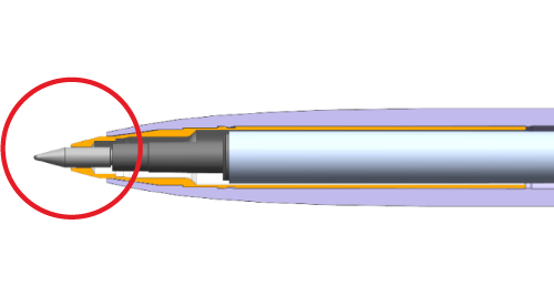 ペン先に金属パーツを内蔵しています。左図(ペン先断面図)のオレンジ色の部分が金属パーツを使用している部分です。