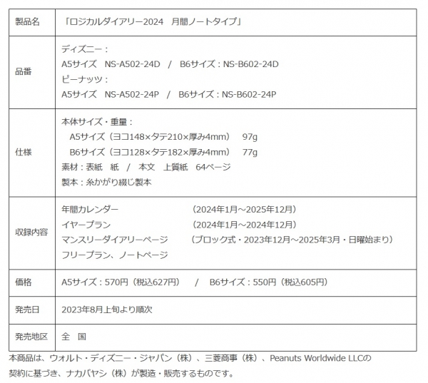 ナカバヤシ株式会社(本社:大阪市中央区、社長:湯本 秀昭)は、 本文罫に“ロジカル罫”を使用した『ロジカルダイアリー』シリーズから、人気のキャラクターアート2種(ディズニー、ピーナッツ)を採用した「ロジカルダイアリー2024 月間ノートタイプ」計8品番を2023年8月上旬より順次全国にて発売します。