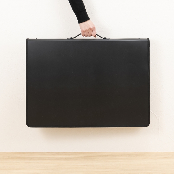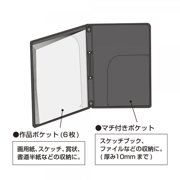 「アーテム グラフィックケース」は、作品ポケットとマチ付きポケットが付いた画用紙サイズの収納ケースです。一般的なケースは内部に仕切りが無く作品を保管するとケース内で折れや反りが起きてしまうことがありましたが、当製品は作品ポケットに一枚ずつ収納できるため作品をしっかりと保護できます。また、マチ付きポケットが付属しているため、スケッチブックや同シリーズのファイル※など厚みのある物(10mm 厚まで)もまとめて収納できます。