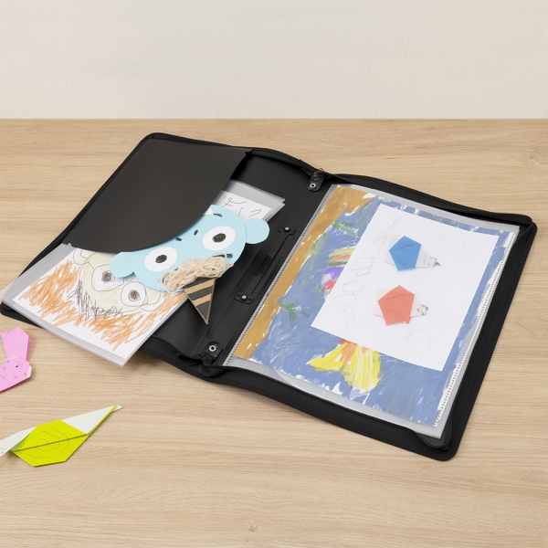・ 画用紙サイズの作品を一枚ずつ分けて収納できるポケット付きの収納ケース。