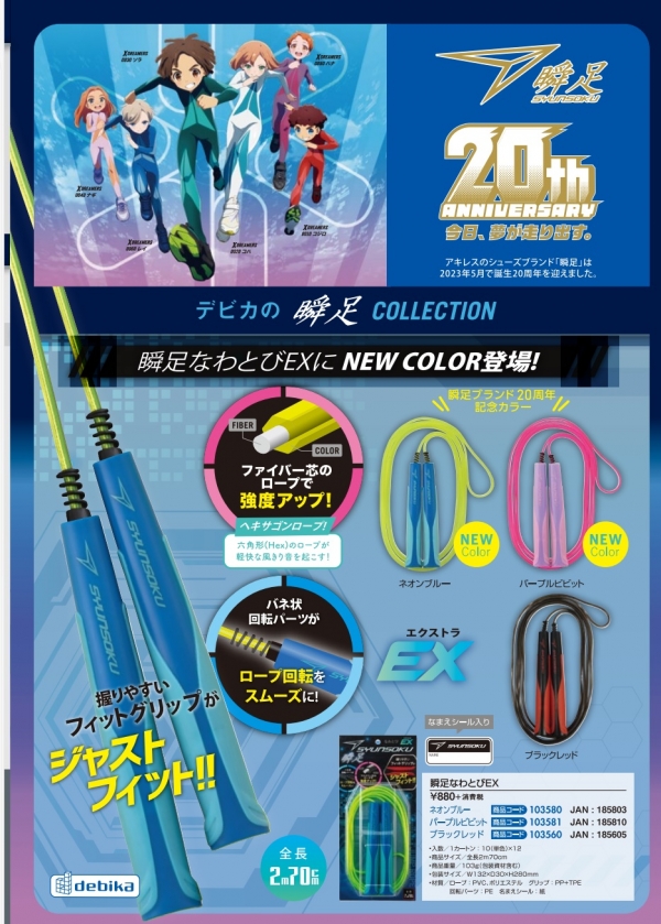 今年20周年を迎えたアキレスの人気シューズブランド「瞬足」。デビカの瞬足なわとびEXからブランド20周年記念カラーが登場です。