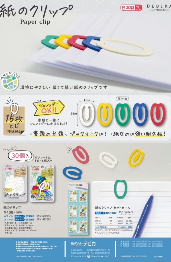 株式会社デビカは、環境にやさしい「紙のクリップ 」2種を8月から発売。400円(税抜) 「紙のクリップ 」は、紙素材100%の環境にやさしい薄くて軽いクリップです。 普通紙なら15枚綴じ。書類と一緒にシュレッダーにかけられる。 書類の分類、ブックマークに便利です。紙なのに強い耐久性。日本製。