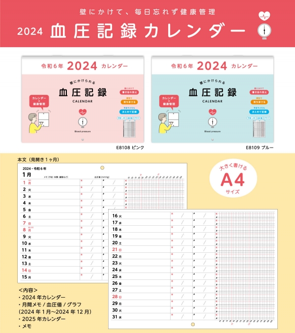 ・2024 血圧記録カレンダー ( ピンク / ブルー )価格¥900(税込¥990)サイズ:A4 210×297㎜ 28P