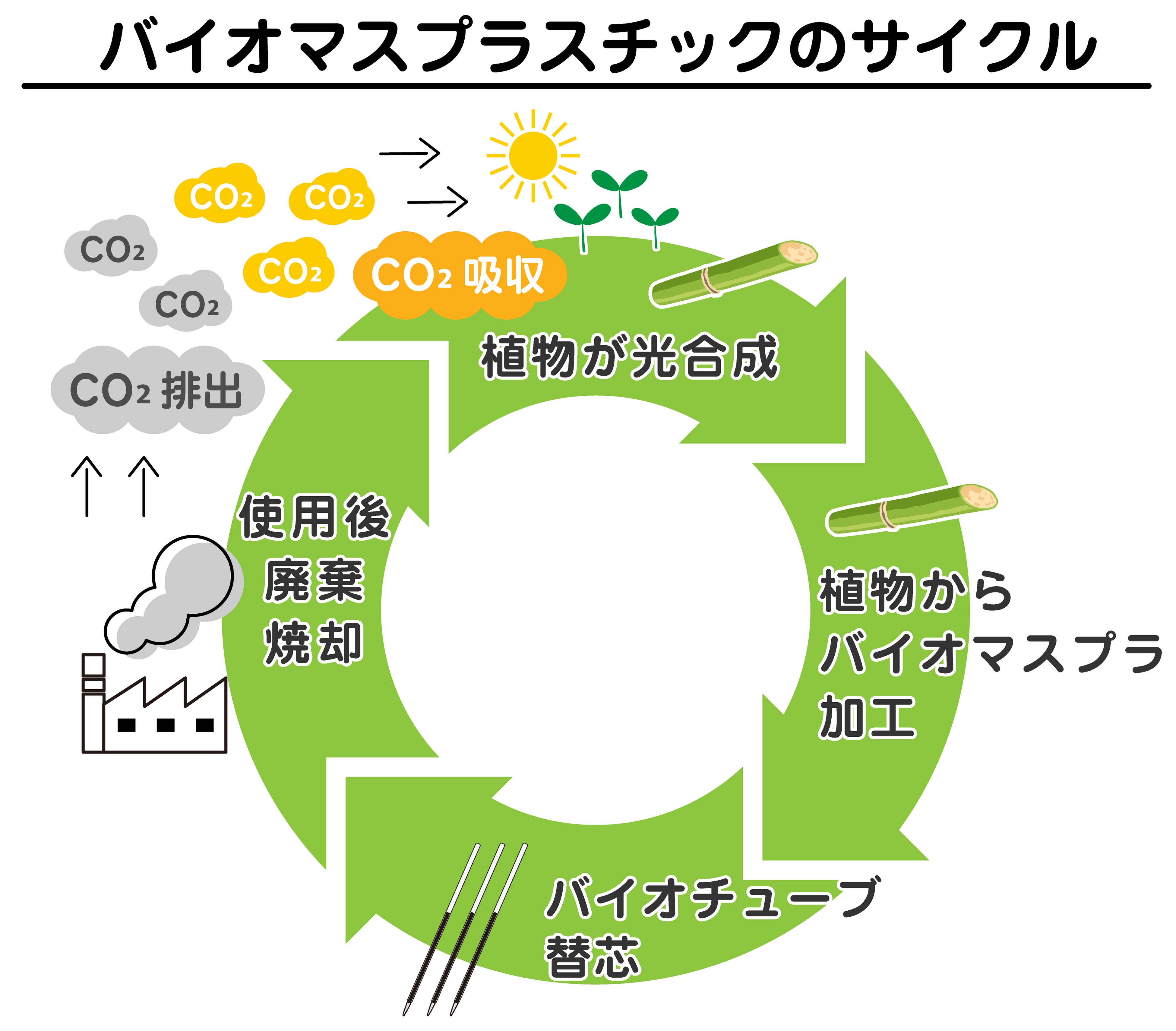 当社は、筆記具を通して持続可能な社会の実現に貢献するため、商品の製造を含めた企業活動全般において地球環境に配慮した行動を目指し、環境に配慮した商品作りをおこなっています。今回の「バイオチューブ」では、商品を通して二酸化炭素排出の削減推進につなげます。