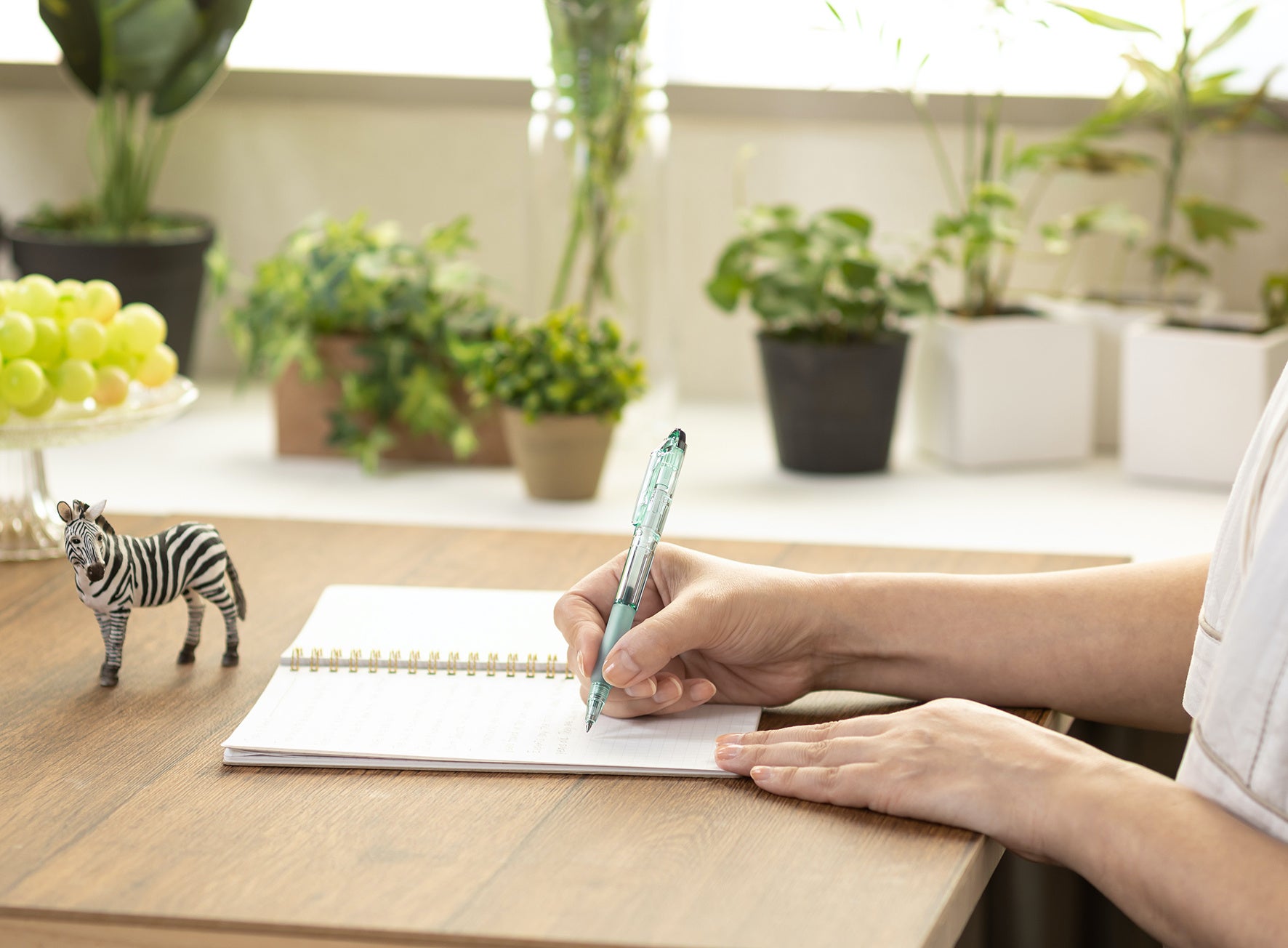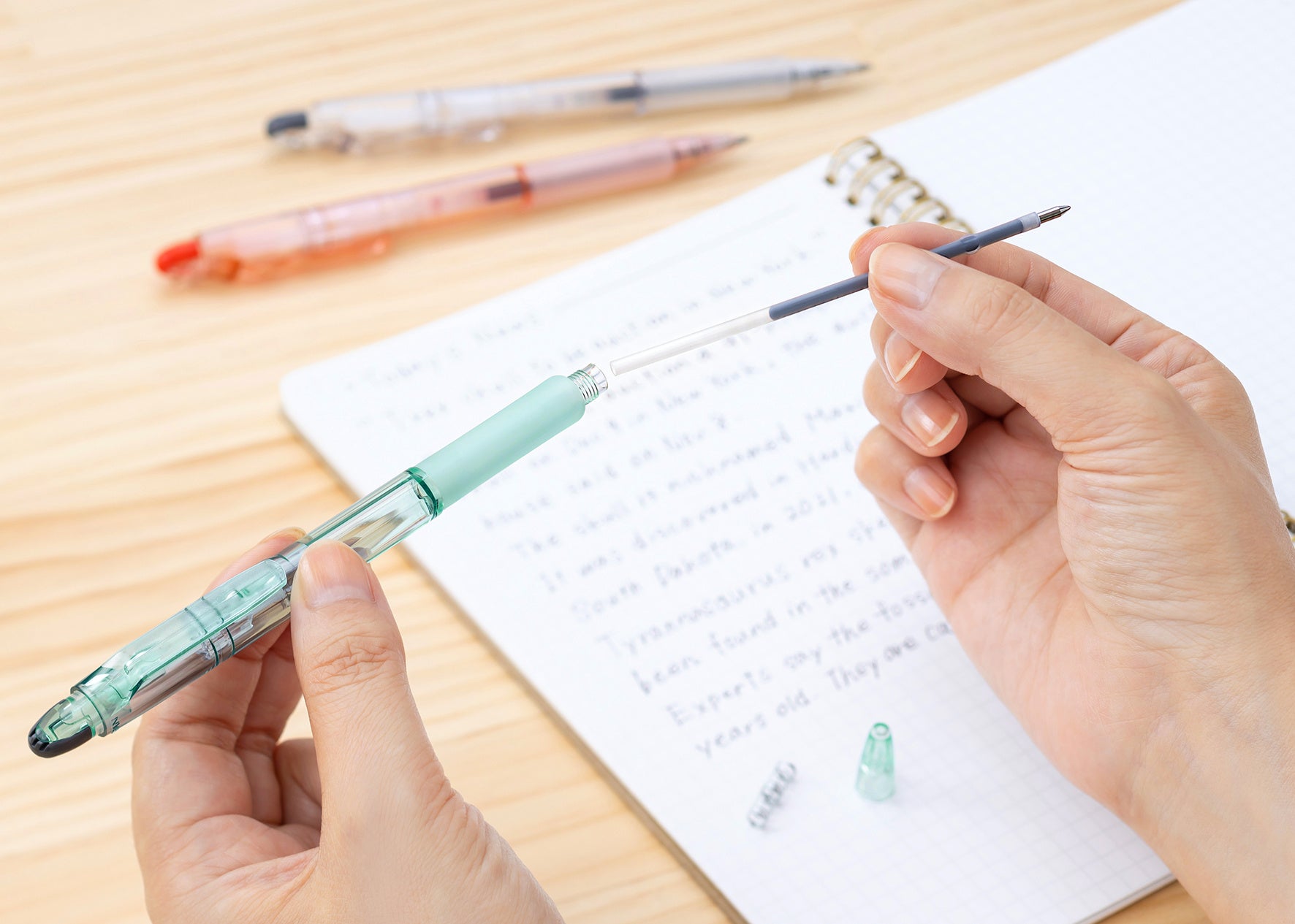 『バイオチューブ搭載ジムノック』は、本体のみならず、替芯にまで環境配慮したボールペンです。インクに直接触れるチューブの材質を変更するのは品質上の課題がある中、バイオマスプラスチック化に成功しました。