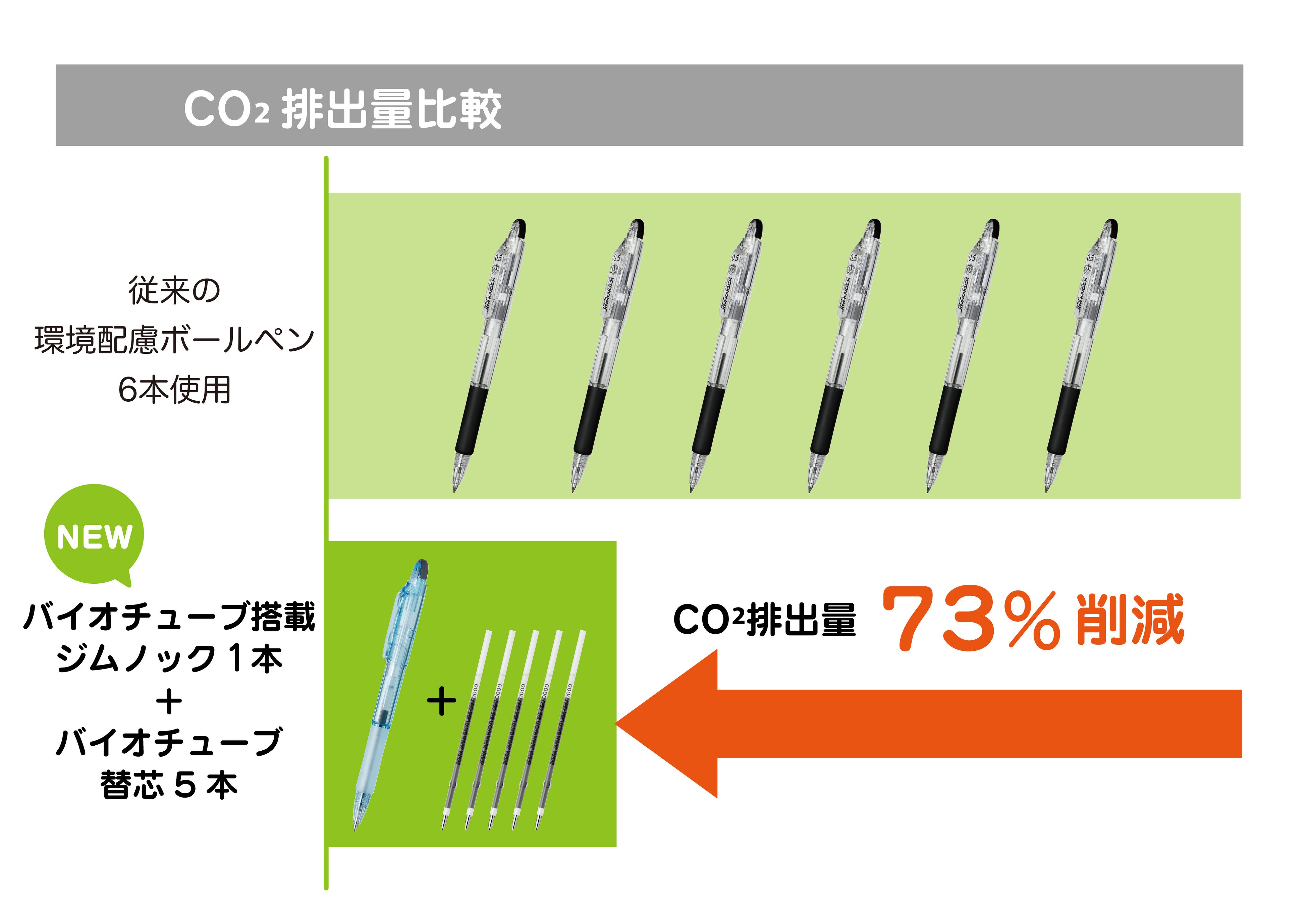 ペン本体を買い替えず替芯交換することで、CO2(二酸化炭素)排出量の削減が期待できます。さらに、『バイオチューブ』を交換して使うことで、CO2排出量を73%削減することができます。※2