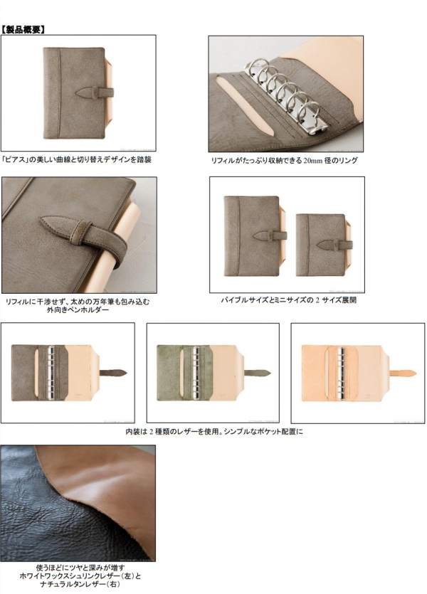 内装には「ナチュラルタンレザー」を用いることで、2 種類の経年変化をお楽しみいただけます。また、バイブルサイズ、ミニサイズともに 20mm の太径リングを採用するなど、現代のニーズに対応した手帳スタイルを実現しました。