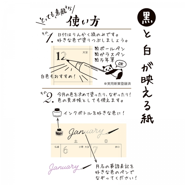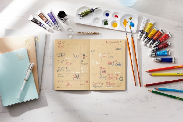 フォーマットは人気の月間ブロック。日付の数字を好きな色で塗りつぶすことができたり、月名の英語表記やインクボトルのイラストを好みの色でなぞることで、自分だけのダイアリーに仕上げる楽しみがあります。