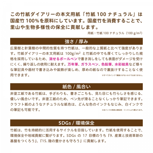 国産竹100%を原料にした「竹紙100ナチュラル」を本文用紙に使用したダイアリーです。