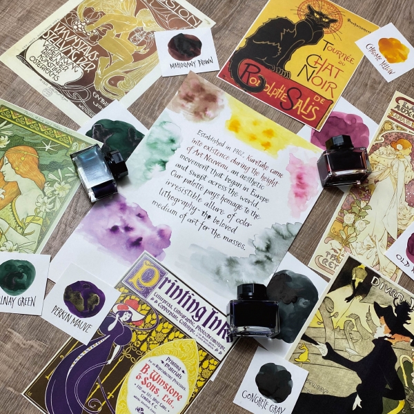 1902年創業の呉竹は、ヨーロッパに端を発し世界中を席巻した美のムーブメント、アール・ヌーヴォー※1の最盛期に誕生しました。当時、大衆芸術として人気を博したカラーリトグラフ※2をモチーフに、時代の流行色をイメージしたインクコレクションです。