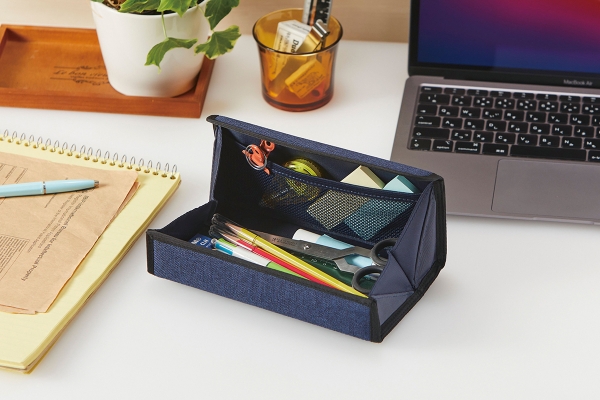 「COHACO NEO(コハコネオ)ペンケース M」はマグネット仕様のため、力を入れずに片手で簡単に開閉できます。フタが大きく開くので、収納物が一目で探しやすく、出し入れしやすいペンケースです。内側には、付箋などを入れられるメッシュポケット付きで、スマートフォンを立てることもできます。筆記具だけでなく、コスメ用品などの化粧ポーチとしても便利です。
