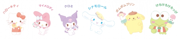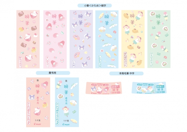 小筆には和菓子モチーフになったサンリオキャラクターズが6種類デザインされています。慶弔用と本格毛筆には、ハローキティ、マイメロディ、クロミがデザインされたピンクとポムポムプリン、シナモロール、けろけろけろっぴがデザインされたブルーの2種類を用意しています。