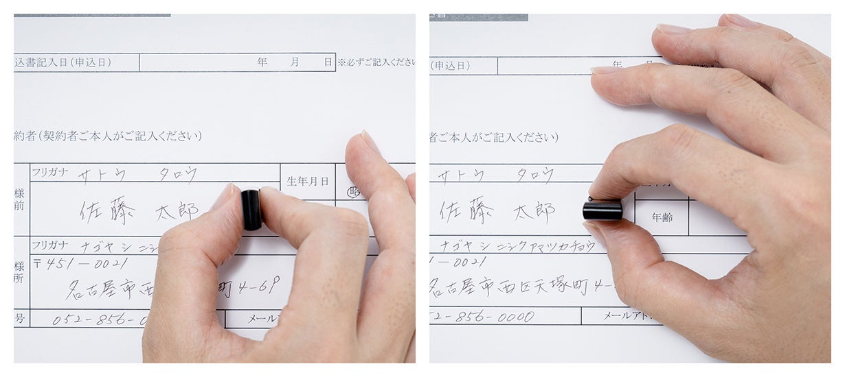 形状から方向が分かりやすく、持ちながらでもハンコの傾きが確認しやすくなっています。ご注文時には縦向き、横向きどちらで印面を加工するか選択することができます。