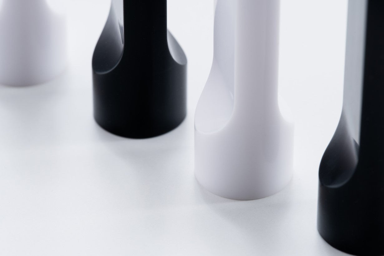 指の触れる箇所は試作の末にたどり着いた最適な曲線。使う人の気持ちを変換する道具としてストレスのない心地よさを実現します。天面部の曲線も柔らかく、持つたびに、そして押すたびに心地よく、愛着が湧いてきます。
