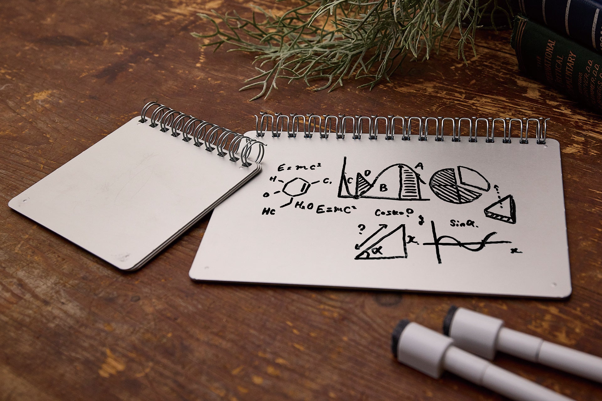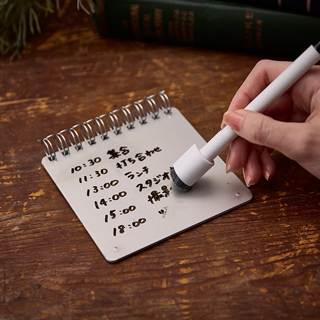 「アルミメモパッド」は、ホワイトボードのように何度も書いて消せる、繰り返し使えるコンパクトなメモパッドです。アルミ素材を採用することで、軽く、耐久性に優れているので、持ち運びに便利です。