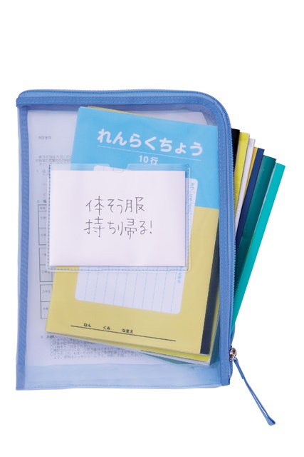 角が割れたり破れたりしにくい軽量で丈夫なメッシュ製を使用し、大きめの教材なども入れられ、入れるものに応じて広がる便利なマチ付きです。内側にはA4サイズのプリントが入れられて、仕分けができるクリアポケット内蔵。表面には日々の連絡事項を入れられて、忘れ物防止に役立つメモポケット付きです。