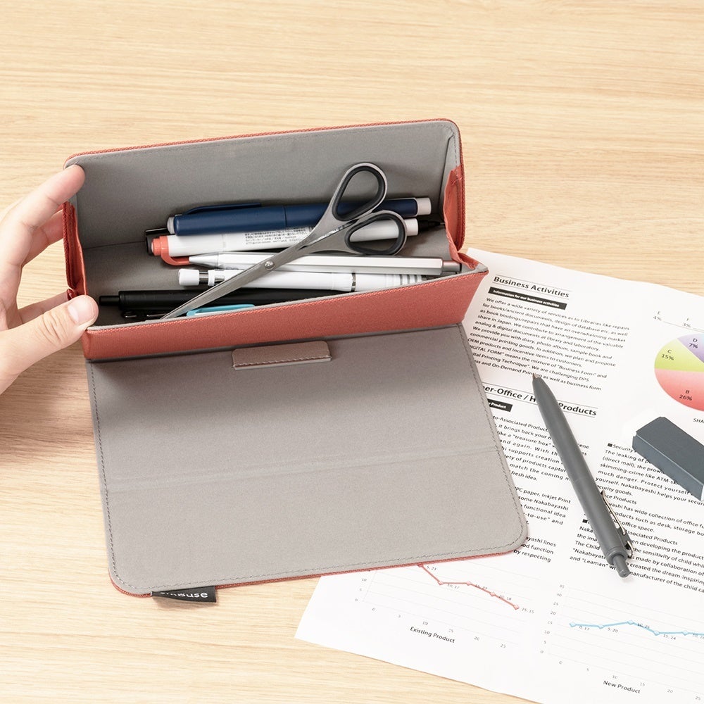 ケースは簡単に開閉できるマグネット式を採用。本体の底は約8cmのマチがあり、たっぷり収納できますので、ペンケースとして、またコードやイヤホンなどを収納するガジェットケースとしてお使いいただけます。また、ハード素材のため、バッグに入れても形が崩れず、眼鏡・腕時計などのアクセサリー収納としても活躍します。本体を覆うフラップを広げることでマウスパッドとして機能します。
