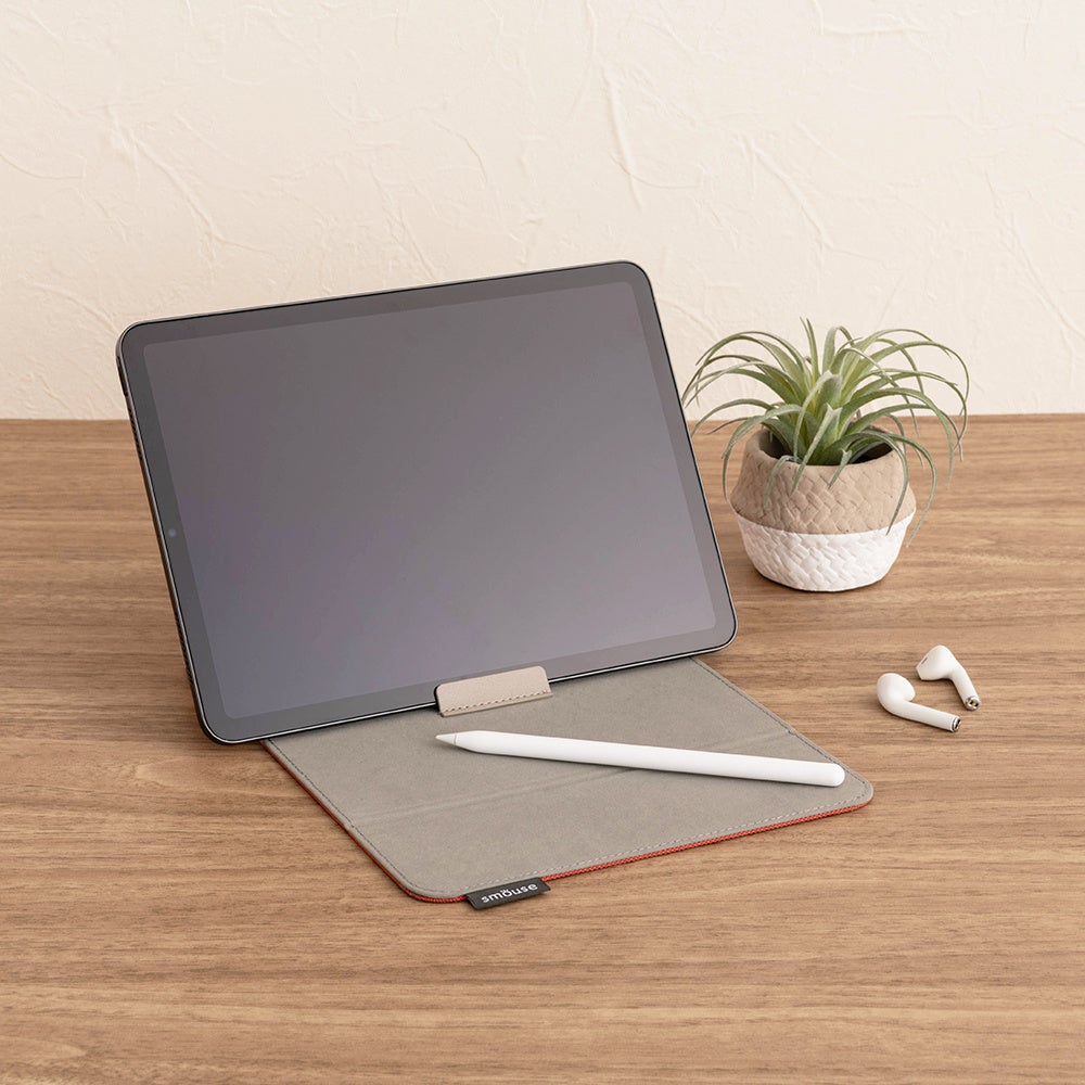 フラップの裏側には、スマートフォンやタブレットなどを立てられるスタンドタブが付いています。動画視聴やオンライン会議用のモバイルスタンド、作業・学習時のブックスタンドとして活用でき、スマートな環境を簡単に作れます。