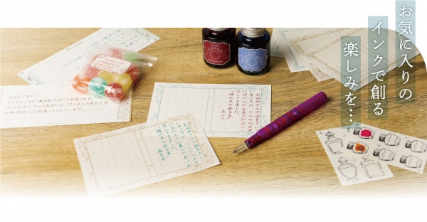 いずれのアイテムも万年筆・つけペン・ガラスペンで書くのに最適な素材をチョイスし、インクとの調和性の高いレトロテイストなデザインに仕上げております。