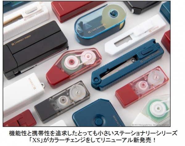 コンパクトながらも 4.2m の修正テープを内蔵した『XS 修正テープ』、のりの切れが良いドットタイプのグルーテープを採用した握りやすい形状の『XS テープのり』、コンパクトに収納できる折り畳み式の『XS コンパクトホッチキス』、左右両利き用でご使用いただけるユニバーサルデザインを採用した『XS カッター』、テープの巻き癖や伸び縮みが少なく、色分けされた目盛が見やすい『XS メジャー<1.5m>』、ワンタッチで刃が収納可能なスライド式の『XS コンパクトハサミ』、軽い力でスムーズにまっすぐテープを切ることができる『XS テープカッター』、小さく折りたためて一度にコピー用紙 5 枚まで穴を開けられる『XS コンパクトパンチ』のこれまでと同様の計 8 アイテムです。