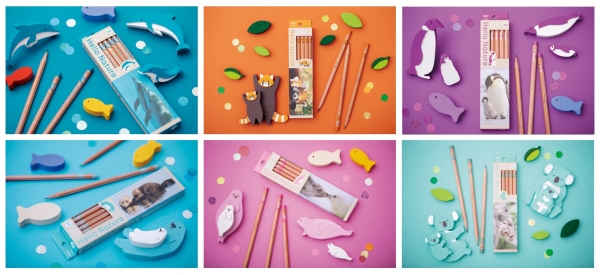 3本入り、6本入り、ギフトセットは動物親子のイラストを包装パックと鉛筆軸にプリントしました。