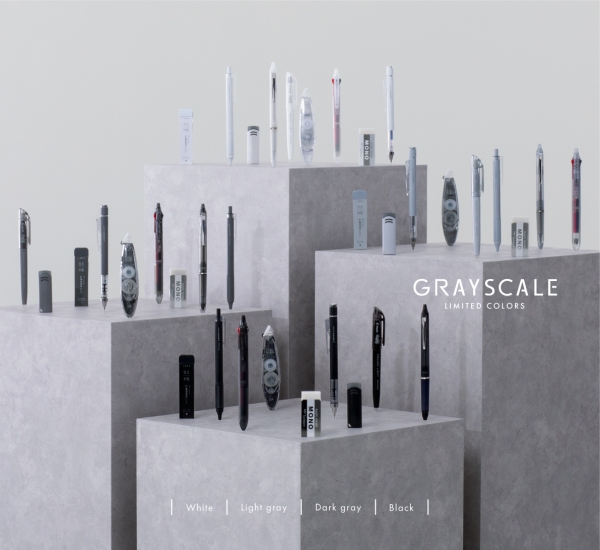 当「グレースケール」は、単に黒(100%)を淡くしたグレー等と違い、各色にニュアンスのあるカラーを選定、文具個々の魅力を大切にしています。
