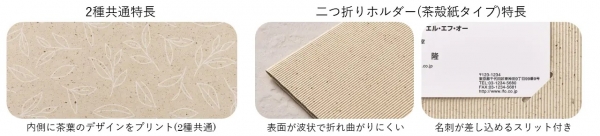 ラインアップは「紙製ホルダー(茶殻紙タイプ)」と「二つ折り紙製ホルダー(茶殻紙タイプ)」の2種類で、いずれも内側に茶葉のデザインをプリントしており、「茶殻紙」ならではの地模様によりホルダーに収納した書類が外から見えづらくなっています。また、「二つ折り紙製ホルダー(茶殻紙タイプ)」には内側に名刺を差し込めるスリットが付いています。「紙製ホルダー(茶殻紙タイプ)」は10枚入り、「二つ折り紙製ホルダー(茶殻紙タイプ)」は2枚入りです。