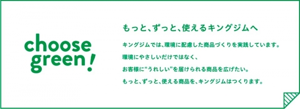 当社は環境に配慮した商品づくりをより積極的に推進していくために、今回「choose green!」という新しい取り組みを始めました。環境に優しいだけではなく、お客様に選んでいただけるように実際に使ったときに心地よい、気分が上がるなど、お客様に“うれしい”、そして環境にも“やさしい”を届けられる商品を企画、開発してまいります。