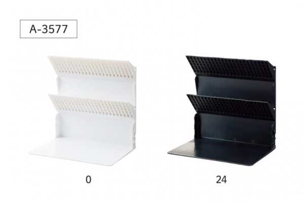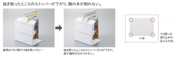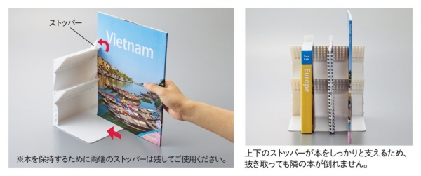 本などの収納物を差し込むだけで、ストッパーが持ち上がり本を支える機能性はそのままに、上下2箇所になったストッパーがしっかりと収納物を保持し、A4サイズの薄い雑誌も安定して立てられます。本体の両サイドのジョイントで複数台を連結でき、既発売のスタンダードサイズ(A-3575)との連結も可能です。