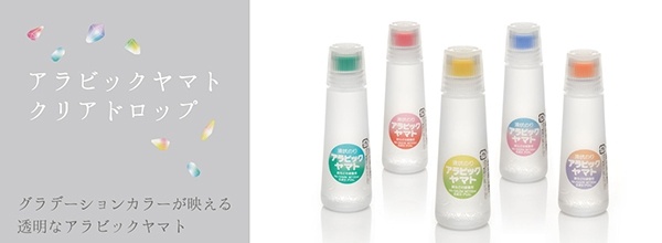 今回発売の「アラビックヤマト クリアドロップ」は、好評だった「アラビックヤマト クリアカラー」同様、透明の液状のりを採用し、ラベルは2カラーのグラデーション仕様で、リラックス感のあるさわやかな印象に仕上げました。また、ドロップというネーミングの通りフレーバーを意識した5つのカラー展開としています。