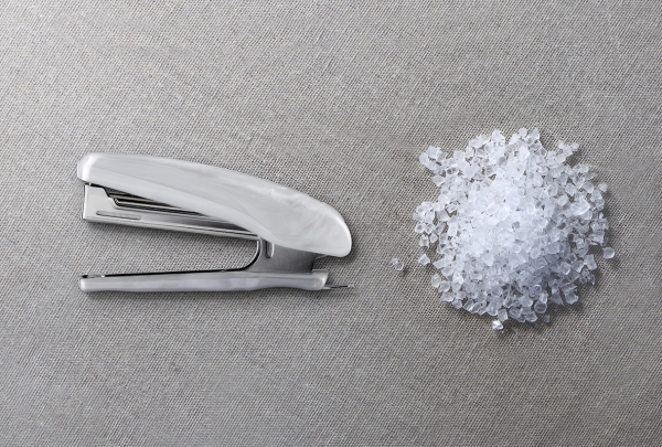 本製品は、本体カバーにサステナブル素材を使用したホッチキスです。このサステナブル素材には、当社コピー機内蔵ホッチキスの部品成型時に出る、これまでは廃棄していたプラスチック端材を再生利用し、バイオマスプラスチックを混ぜ合わせています。デザインは素材を混ぜ合わせることでできた自然な模様で、1個1個が少しずつ異なるパール調となっています。