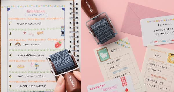 この度、発売する「回転デコレーションスタンプ わたしびより」は、美濃和紙を中心とした便箋やマスキングテープ、シールなどの紙製品で知られる古川紙工の手帳デコレーションアイテムシリーズ「わたしびより」とのコラボレーション商品です。「なんでもない日をかわいく彩る」がコンセプトの「わたしびより」ならではの“ほっこりかわいい”デザインで、紙面をかわいらしく演出できます。また、印影に水性ペンなどで色付けすると、さらに華やかなデコレーションを楽しむことができます。