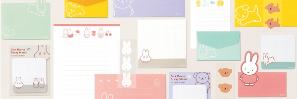 ラインアップは、『ディック・ブルーナ レター』<全5種、価格:495円(税込)>、『ディック・ブルーナ ミニメッセージ』<全5種、価格:385円(税込)>、『ディック・ブルーナ 付箋』<全5種、価格:385円(税込)>、『ディック・ブルーナ メモパッド』<全5種、価格:495円(税込)>の全4アイテムです。