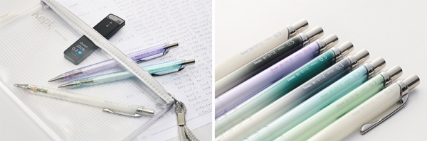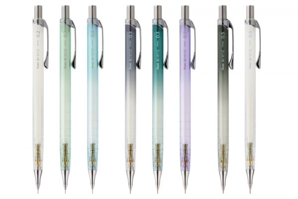 0.2は「グラスホワイト」「ミントグリーン」「ウォーターブルー」の3色、0.3は「グレー」「スモーキーブルー」「バイオレット」の3色、0.5は「ブラック」「アイスホワイト」の2色と、芯径別に併せ持ちした際の組み合わせも楽しんでいただけるようなラインナップにしています。