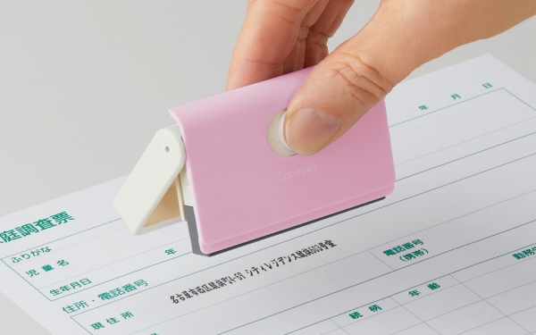 この度発売する「キャップレス一行印 PORTE」は、ポンと押すだけで、面倒な住所書きを簡単にきれいにできるインキ内蔵式のスタンプです。カバーロック付きなので安心して持ち運ぶことができ、片手で印面カバーの開閉からなつ印までスムーズかつ簡単に行えるキャップレスタイプの一行印です。保育園・幼稚園や学校、病院、役所などの書類への住所記入が必要な場面で活躍。特に入園・入学、新生活シーズンで環境が変わり提出書類が多くなるこれからの時期に最適です。