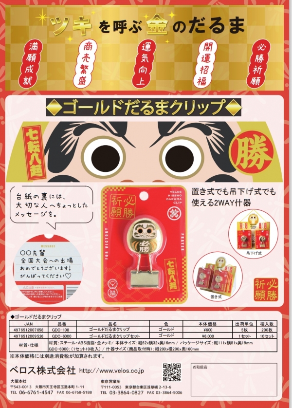 ベロスは、ツキを呼ぶ金のだるま「ゴールドだるまクリップ」を発売。(600円(税別)) 「ゴールドだるまクリップ」は、 満願成就・商売繁盛・運気向上・開運招福・必勝祈願! 台紙の裏には大切な人へのちょっとしたメッセージを書き込めます。