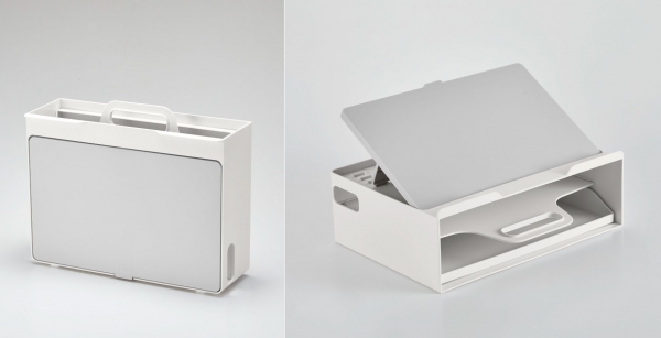 PC作業に必要なアイテムをひとまとめにでき、作業時はスタンドを立ててノートPCをセットすれば、すぐに仕事空間を整えることができます。