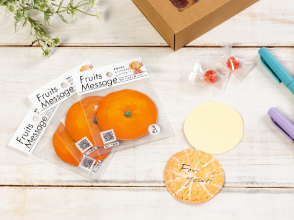 特長 :フルーツを食べる時に皮をむくように、紙を破くと中からメッセージが現れます。