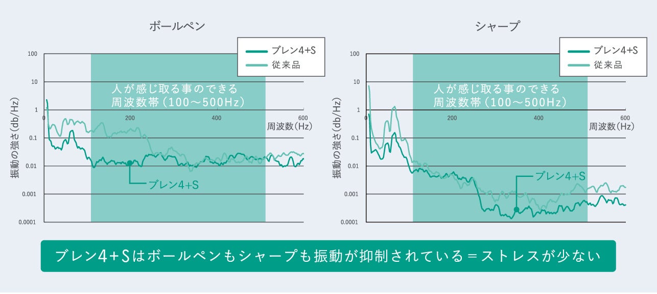 『ブレン4+S』は、ボールペンでもシャープでも人が感じ取る事のできる周波数帯で振動値が従来品に比べて低く、制御されていることがわかっています。