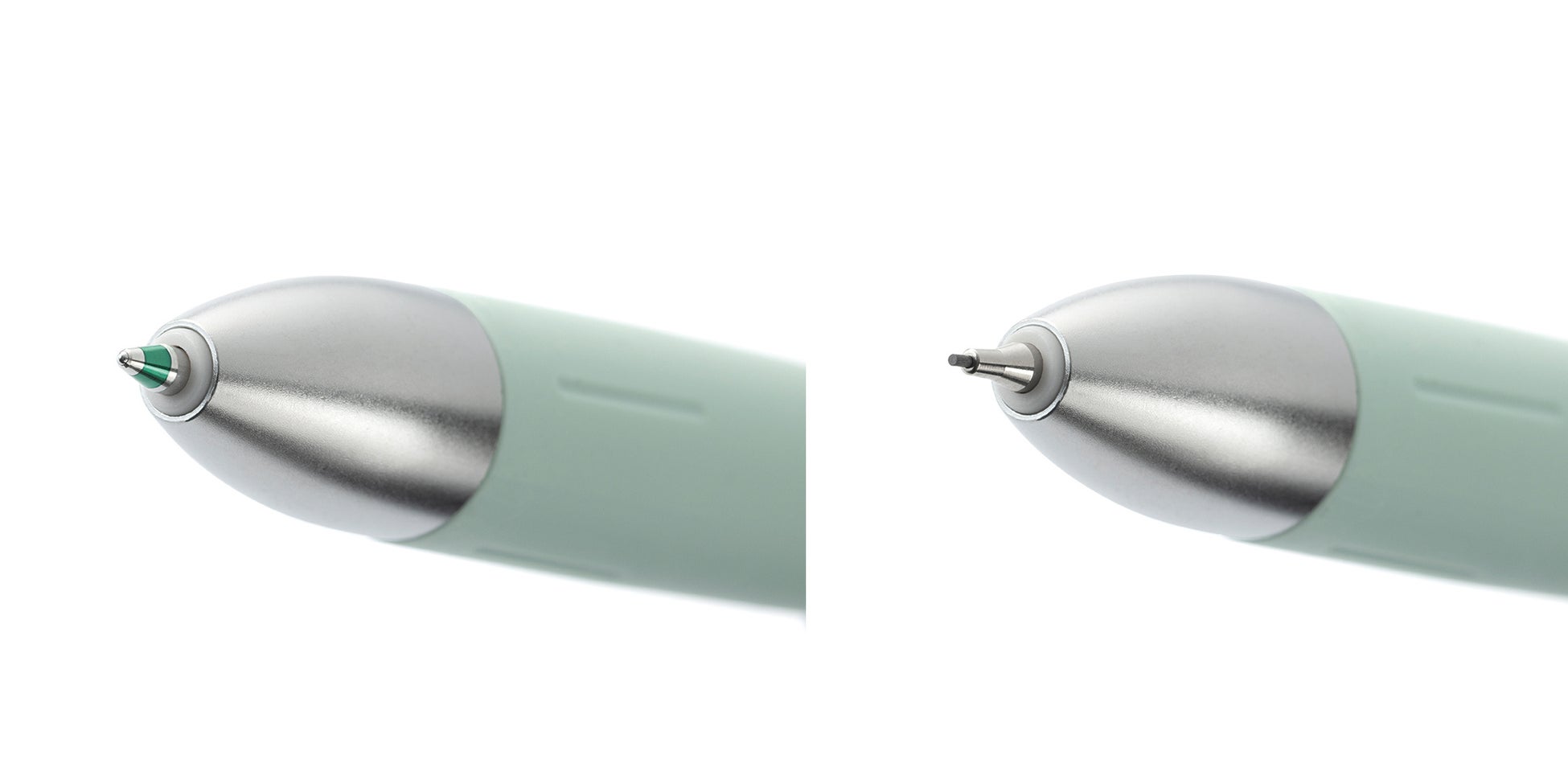 ・バインダークリップを開いたときに根元が軸内部に潜りこむような形状や、消しゴムのキャップ部分を、ボールペンのノック部分にフィットした形状にして、シームレスなデザインに。