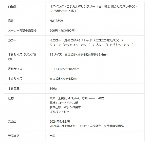ナカバヤシ株式会社(本社:大阪市中央区、社長:湯本 秀昭)は、古川紙工株式会社(本社:岐阜県美濃市 社長:古川 慎人)とコラボレーションした「スイング・ロジカルWリングノート 古川紙工 焼きたてパンタウン」を2024年4月上旬より全国で発売します。また、発売に先駆け3月上旬より順次ロフトにて先行発売いたします。